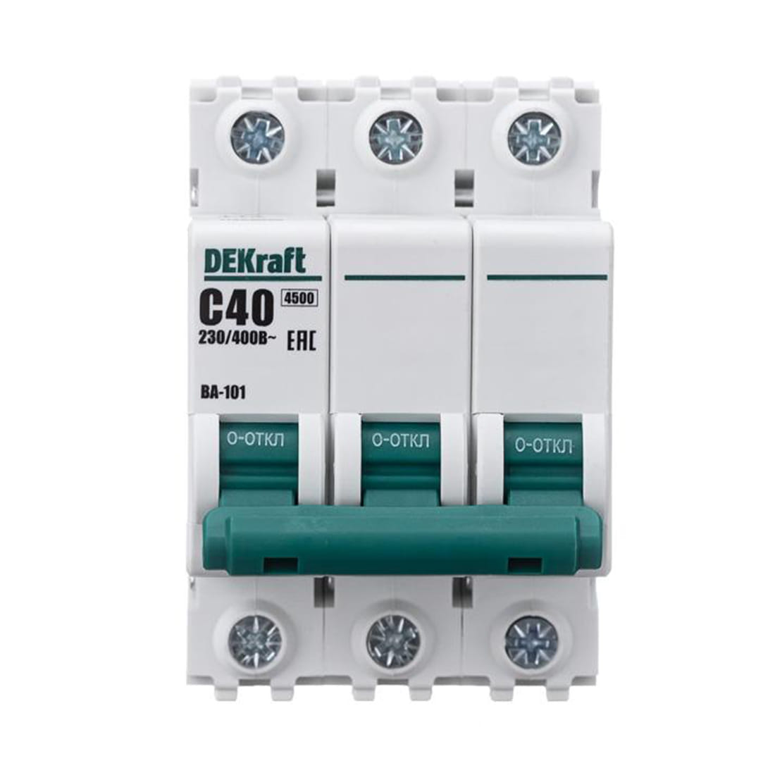 Автоматический выключатель серии ВА-101 DEKraft; 3P; номинальный ток 40 А; характеристика С; отключающая способность 4,5 кА. Новый механизм расцепления мгновенно разрывает цепь при возникновении аварии. 5 монолитных заклепок повышают прочность корпуса аппарата. Сплошная лицевая панель обеспечивает безопасность эксплуатации аппарата. Боковые каналы охлаждения повышают стабильность работы при высоких температурах окружающей среды. Полностью автоматизированный контроль качества производства.