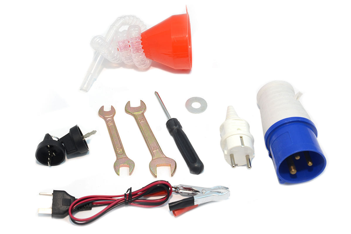 Электрическая вилка, разъем для АВР, предпусковой подогреватель, комплект проводов, ручки и колёса |
