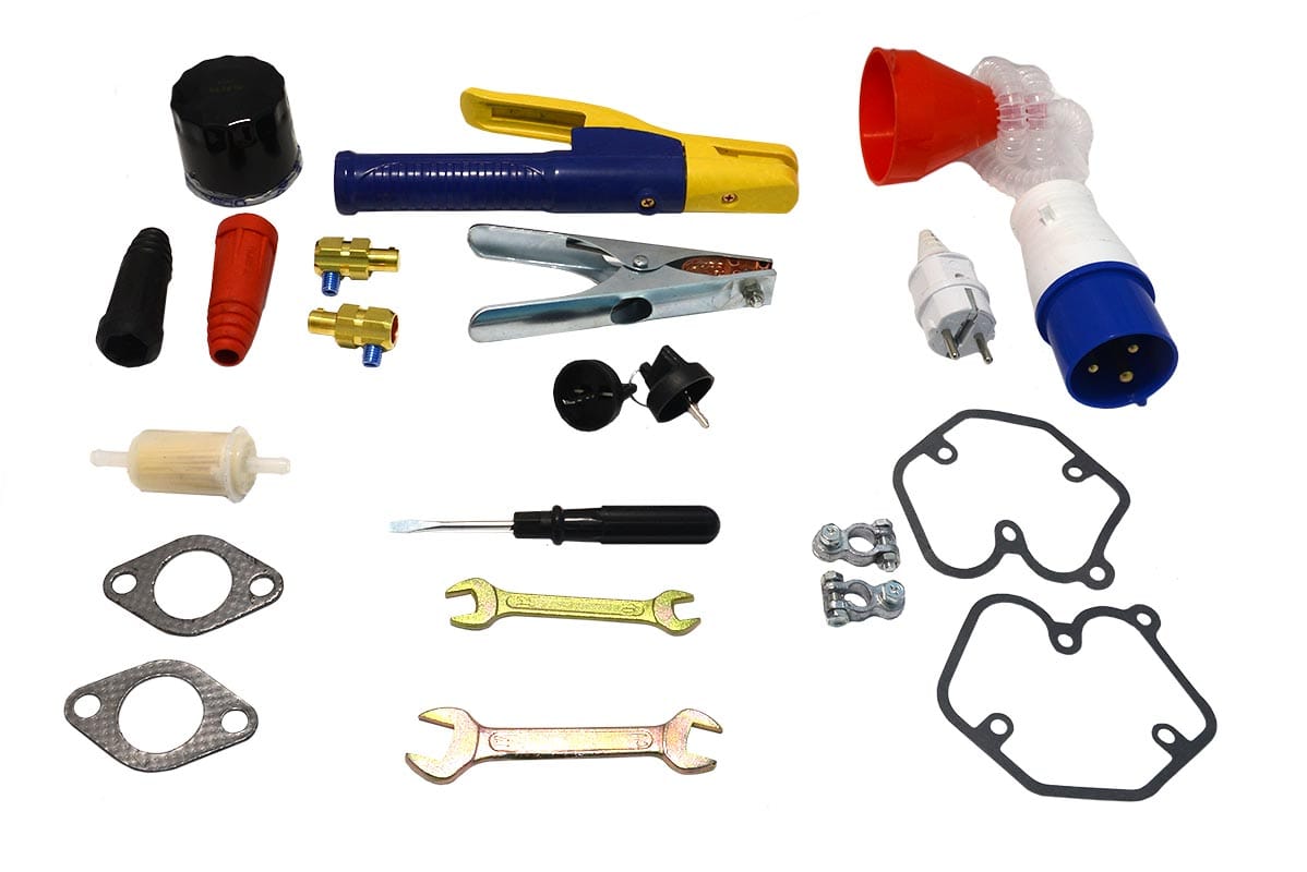 Колеса, КЗ, ЭД, кабельные штекеры, инструмент, 2 вилки, ЗИП, РЭ, гарантийный талон. |